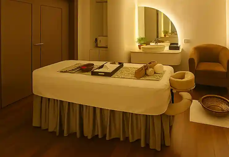 The spa offers Deep Tissue Massage, Swedish Massage, Abhyanga Massage, express therapies, and select salon services like hair spa, grooming, and facials.