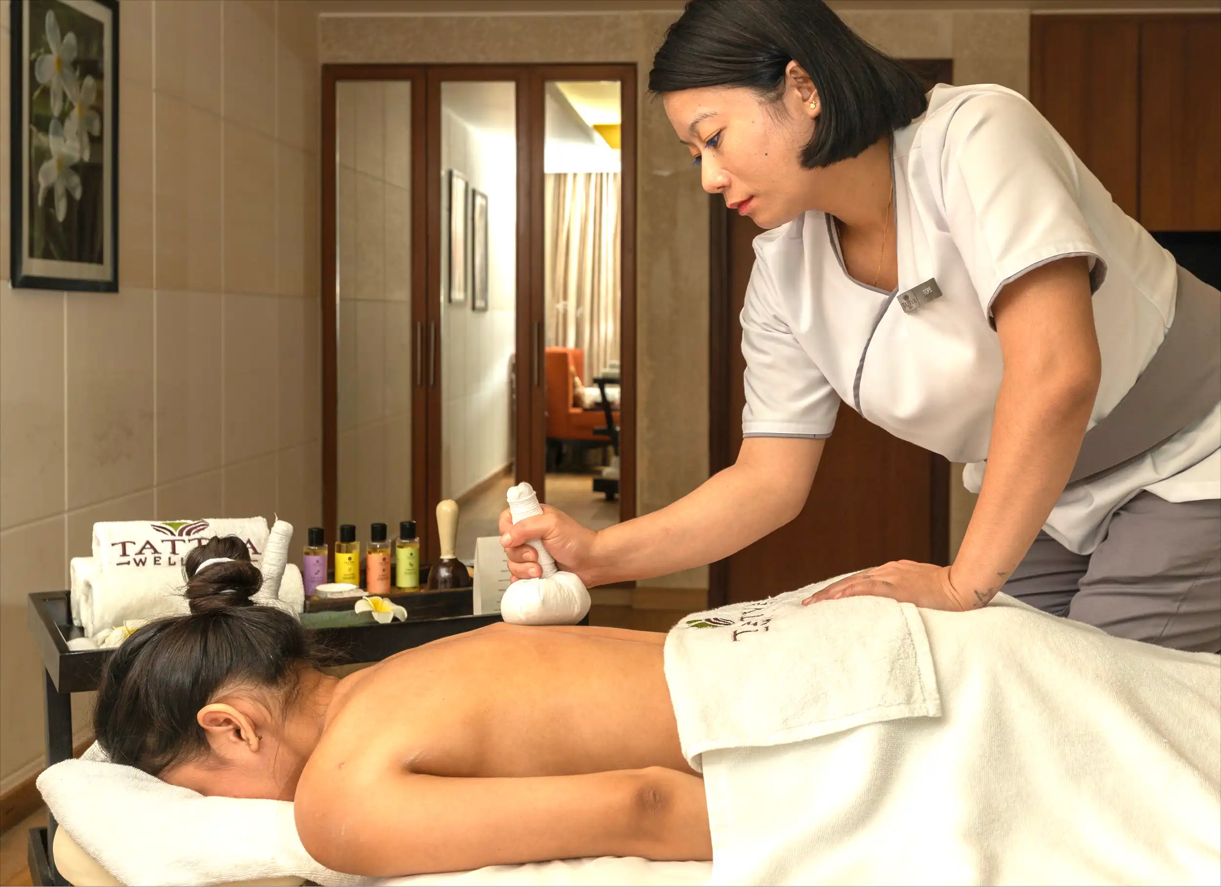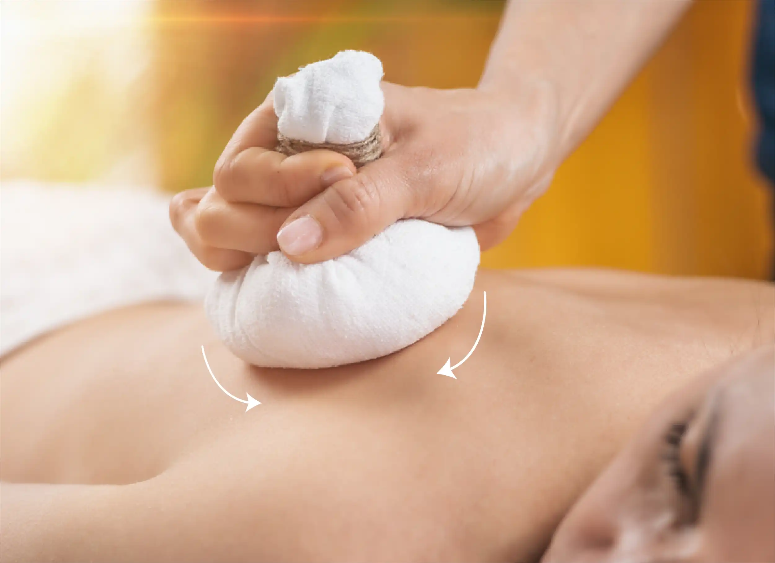 During the session, warm potlis are gently pressed and slid across the body using techniques such as sliding, press–release, palm circling, cross strokes, and thumb glides. These movements allow the medicinal heat and oils to penetrate deep into muscles and joints, easing stiffness and melting away fatigue. The therapy concludes with soothing effleurage and light vibrations, harmonizing the body and calming the mind.