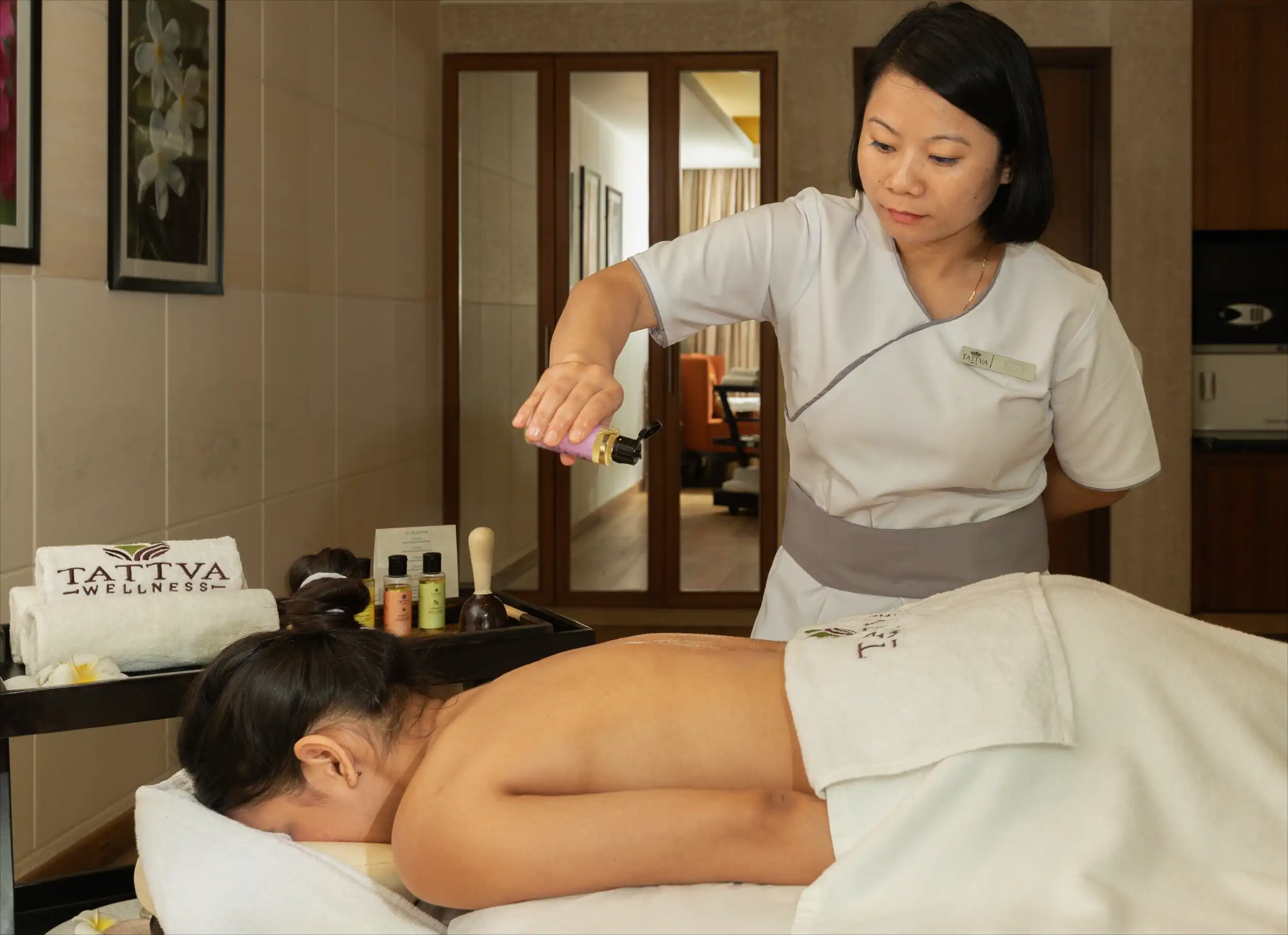 Ans) Tattva Spa offers a holistic range of massages such as Head Massages, Swedish massages, Foot Massages, Lymphatic Face Massages, Neck & Shoulder Massages, Travel Energizer Massages, Back Massages, Head Massages, Ayurvedic Shirodhara Massages, Ayurvedic Poultice Massage, Aromatherapy Massage, and Deep tissue massage.