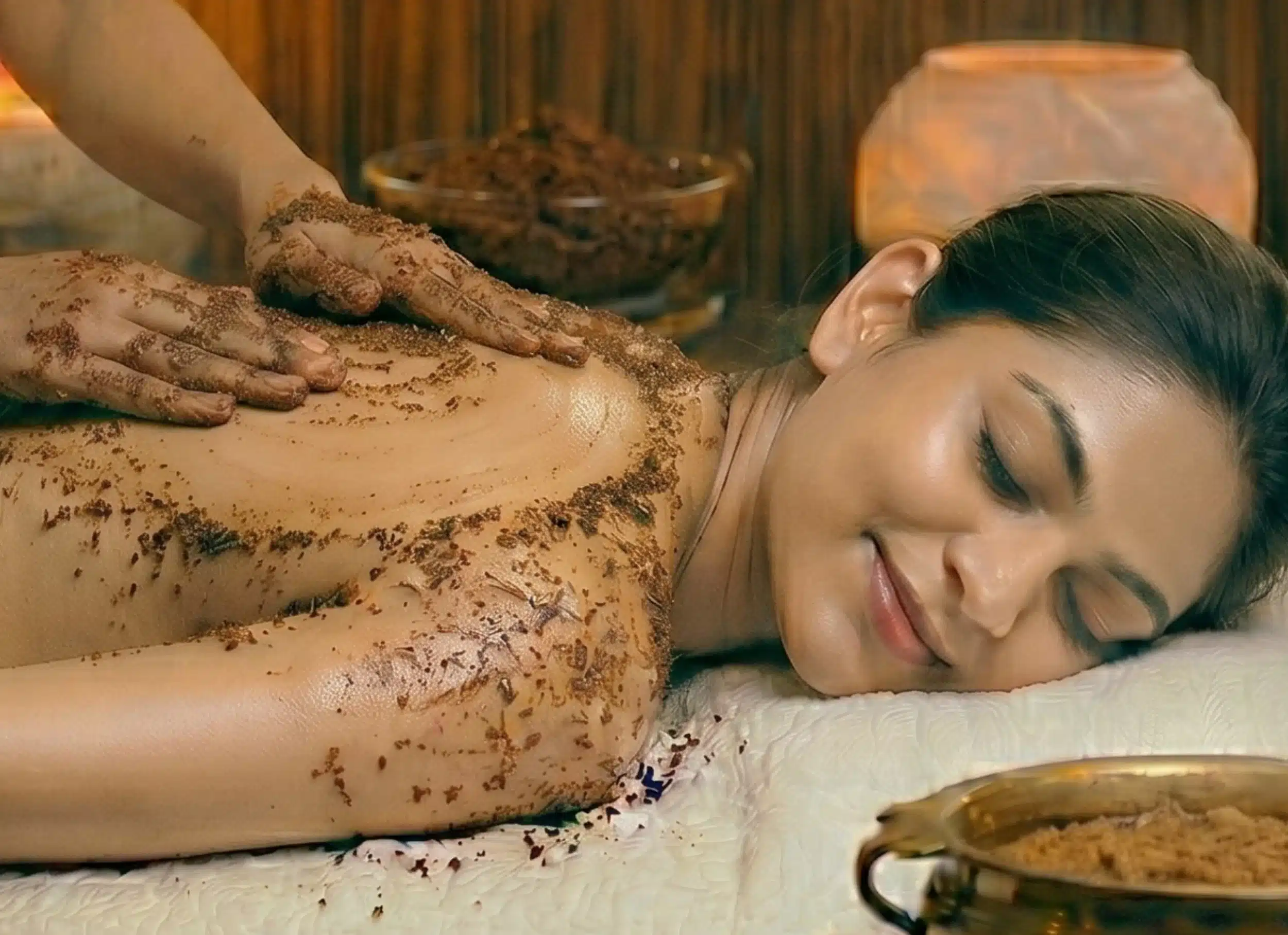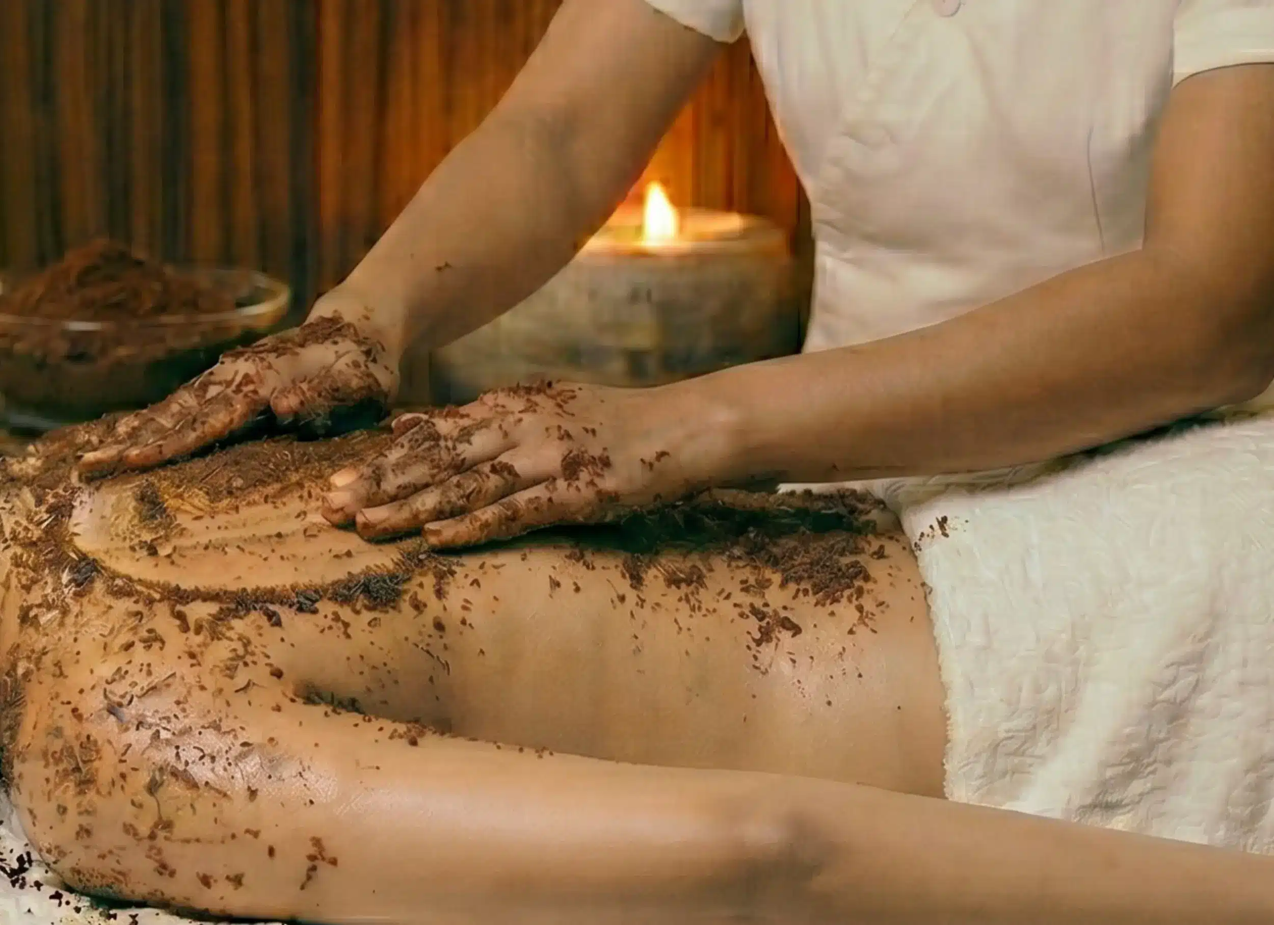 It is a professional spa body scrub treatment that uses natural sea salt to exfoliate and spirulina to detoxify and nourish the skin. Performed by a trained therapist, the treatment removes dead skin cells, purifies the surface, and leaves the skin visibly smoother and more refreshed.