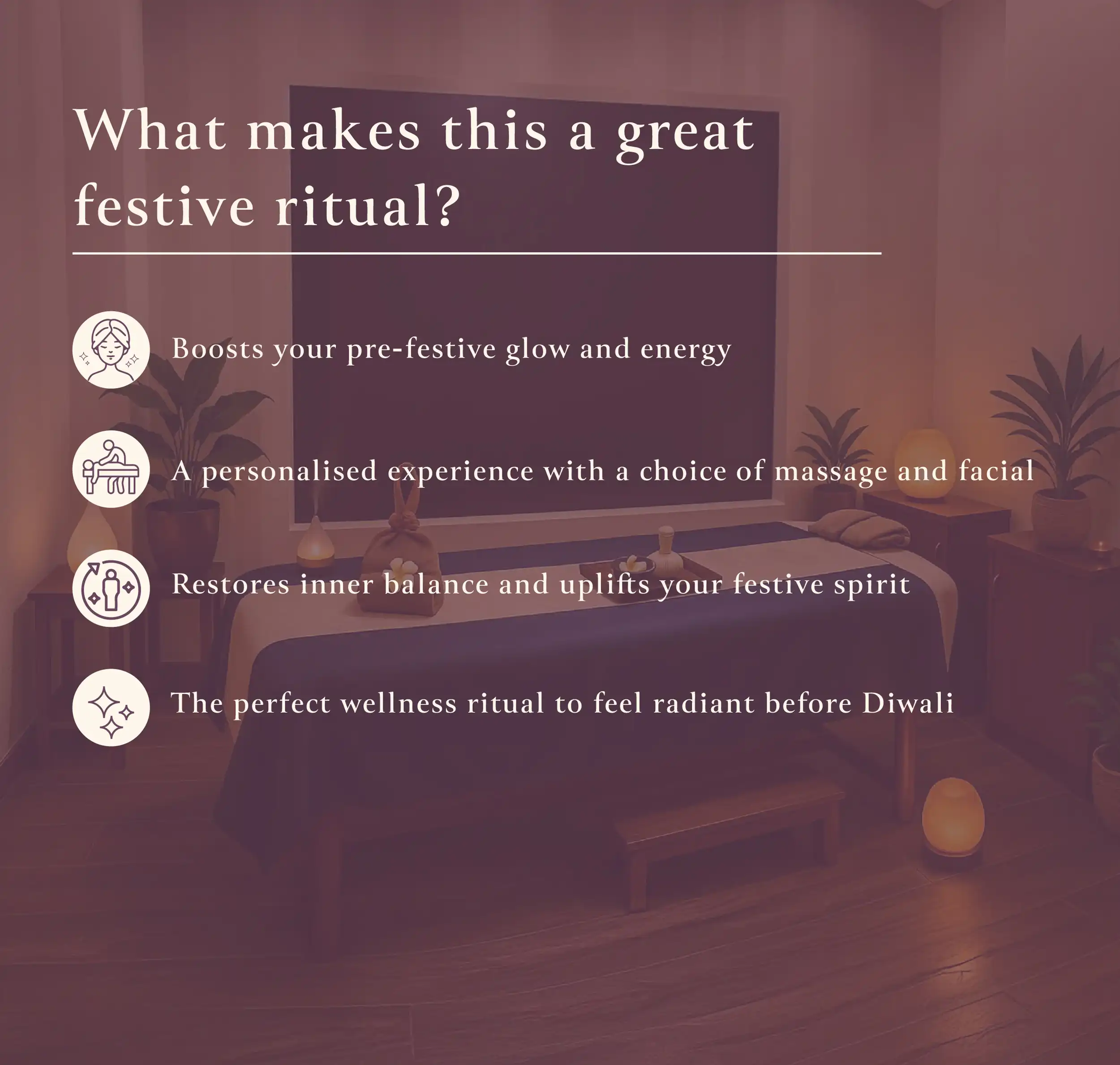 This ritual is designed to make you feel vibrant, confident, and radiant as you step into the festivities. Thoughtful, uplifting, and deeply rejuvenating, this package is your perfect pre-Diwali glow companion.