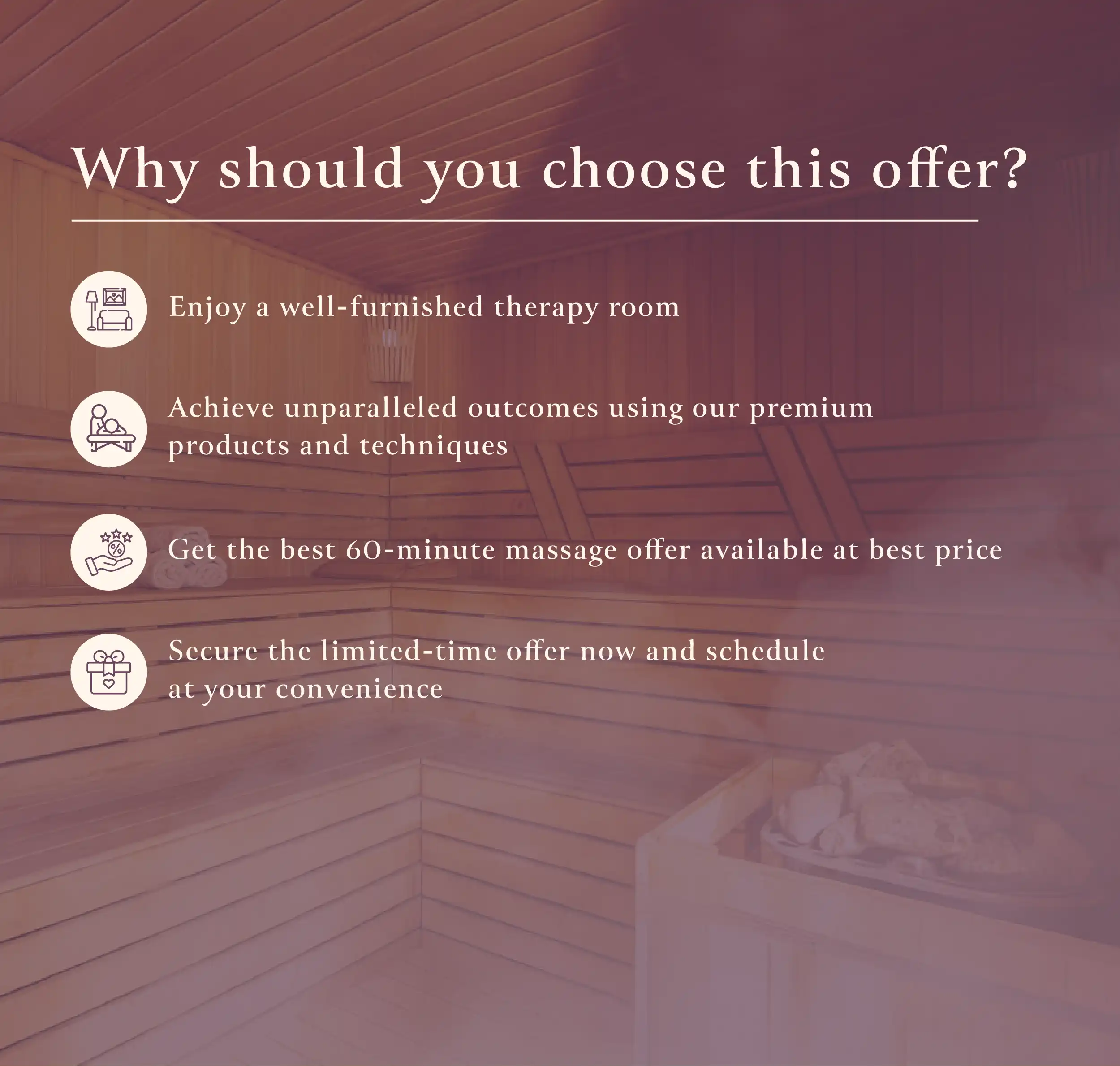 Inclusions: 60-min service for 1 person + Steam + Shower