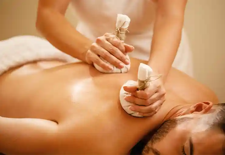 Warm herbal pouches filled with lemongrass, herbs, and medicinal leaves are used to massage the body, easing: